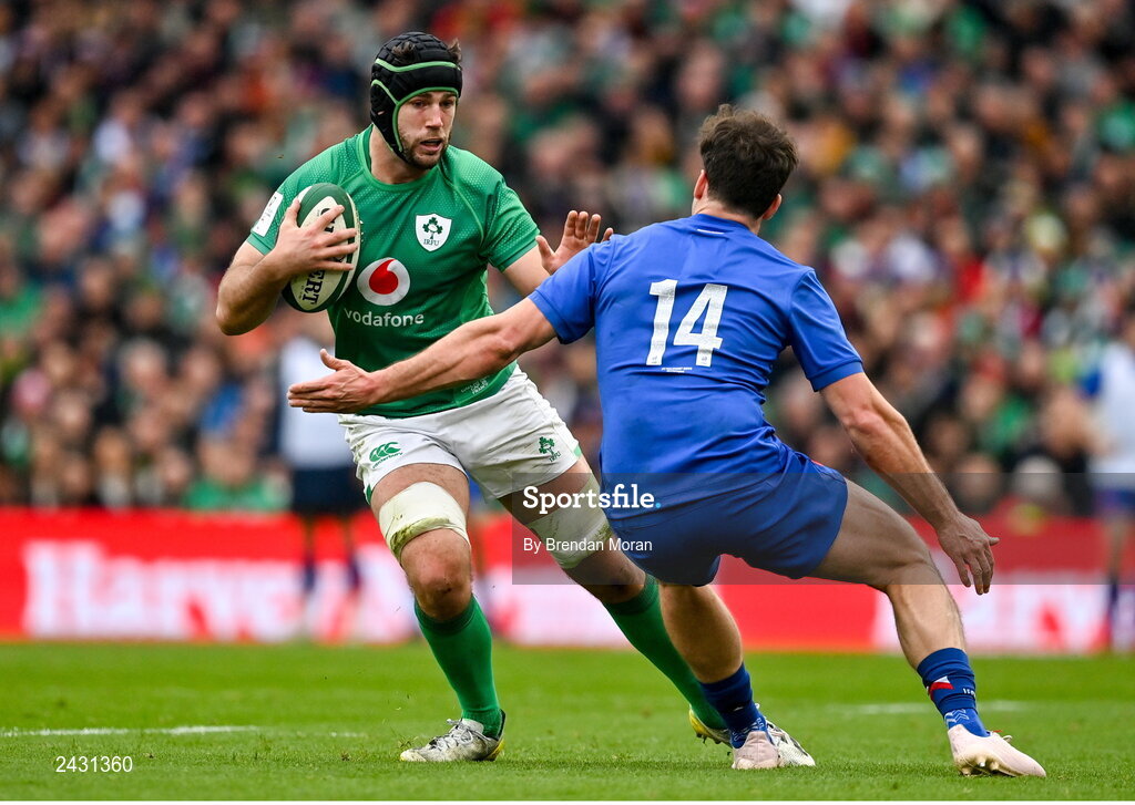 11 February 2023; Caelan Doris of Ireland in action against Damian Penaud of France during the Guinness Six Nations Rugby Championship match between Ireland and France at the Aviva Stadium in Dublin. Photo by Brendan Moran/Sportsfile