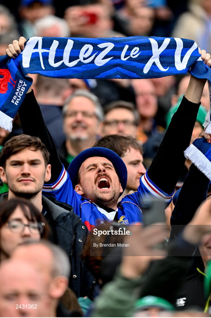 11 February 2023; A France supporter sings the French national anthem 'La Marseillaise' before the Guinness Six Nations Rugby Championship match between Ireland and France at the Aviva Stadium in Dublin. Photo by Brendan Moran/Sportsfile