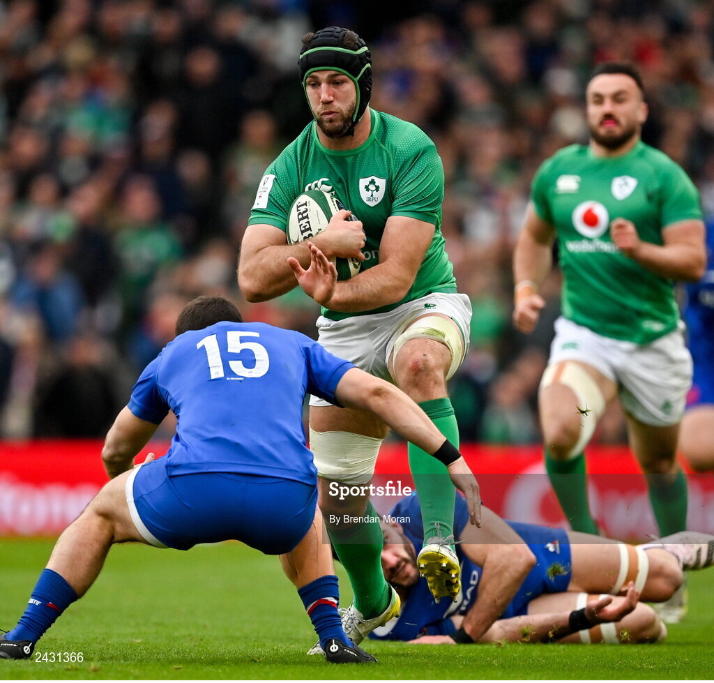 11 February 2023; Caelan Doris of Ireland in action against Thomas Ramos of France during the Guinness Six Nations Rugby Championship match between Ireland and France at the Aviva Stadium in Dublin. Photo by Brendan Moran/Sportsfile