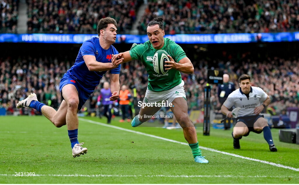 11 February 2023; James Lowe of Ireland on his way to scores his side's second try despite th e tackle of Damian Penaud of France during the Guinness Six Nations Rugby Championship match between Ireland and France at the Aviva Stadium in Dublin. Photo by Brendan Moran/Sportsfile