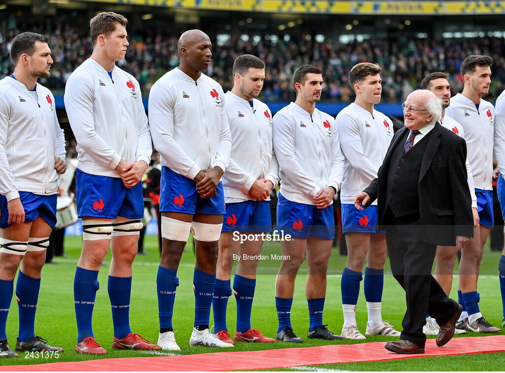 11 February 2023; President of Ireland Michael D Higgins makes his way to meet the French team before the Guinness Six Nations Rugby Championship match between Ireland and France at the Aviva Stadium in Dublin. Photo by Brendan Moran/Sportsfile