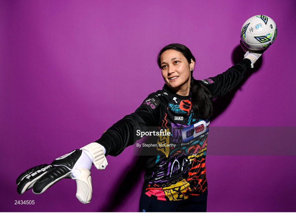 30 January 2023; Goalkeeper Eve Badana poses for a portrait during a DLR Waves squad portrait session at Beckett Park in Cherrywood, Dublin. Photo by Stephen McCarthy/Sportsfile