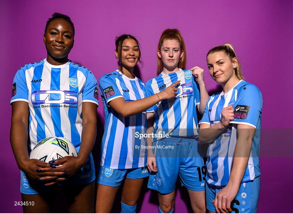 30 January 2023; Players, from left, Vanessa Ogbonna, Neema Nyangasi, Robyn Bolger and Freya Roche pose for a portrait during a DLR Waves squad portrait session at Beckett Park in Cherrywood, Dublin. Photo by Stephen McCarthy/Sportsfile