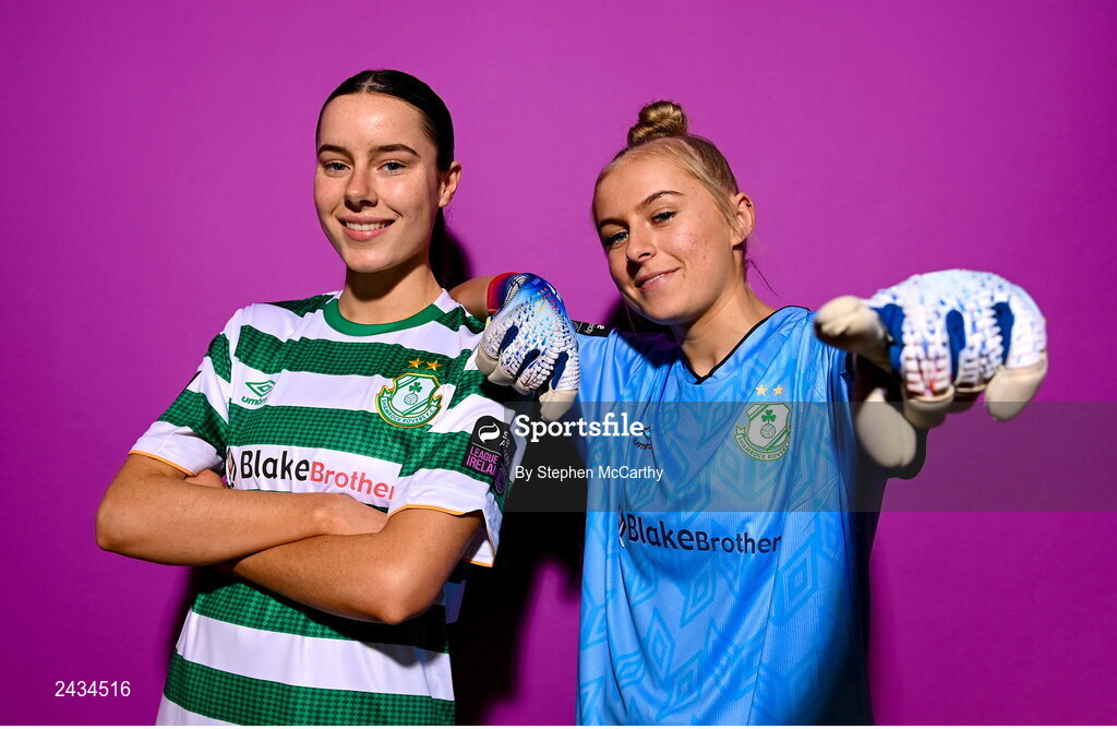 7 February 2023; Aoife Kelly, left, and goalkeeper Summer Lawless pose for a portrait during a Shamrock Rovers squad portrait session at Roadstone Group Sports Club in Dublin. Photo by Stephen McCarthy/Sportsfile