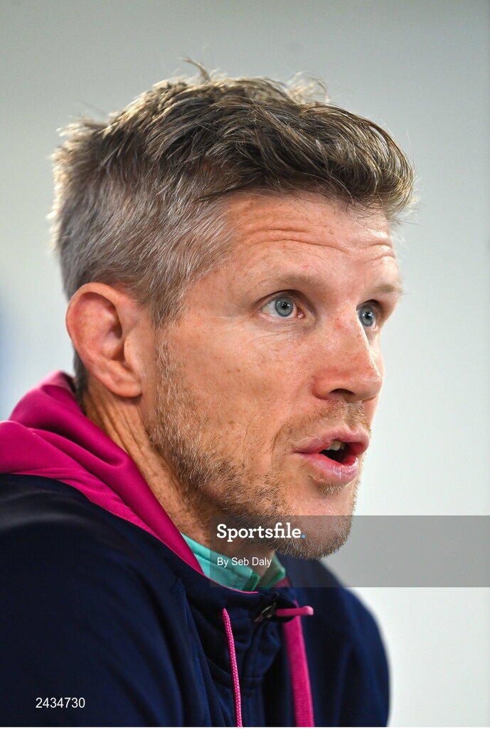 16 February 2023; Defence coach Simon Easterby speaking during an Ireland rugby media conference at the IRFU High Performance Centre on the Sport Ireland Campus in Abbotstown, Dublin. Photo by Seb Daly/Sportsfile