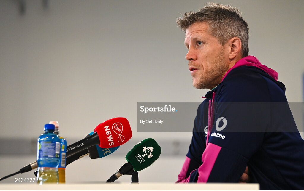 16 February 2023; Defence coach Simon Easterby speaking during an Ireland rugby media conference at the IRFU High Performance Centre on the Sport Ireland Campus in Abbotstown, Dublin. Photo by Seb Daly/Sportsfile