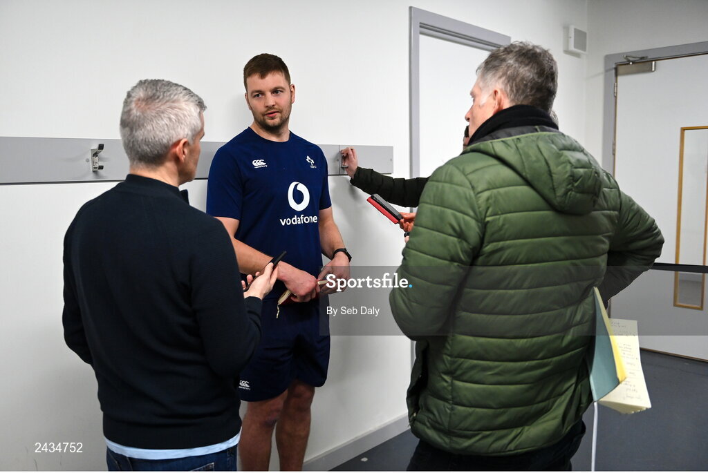 16 February 2023; Iain Henderson speaking during an Ireland rugby media conference at the IRFU High Performance Centre on the Sport Ireland Campus in Abbotstown, Dublin. Photo by Seb Daly/Sportsfile