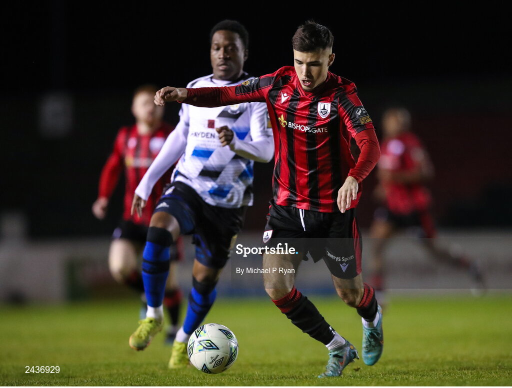 18 February 2023; Joshua Giurgi of Longford Town in action against Jamar Campion-Hinds of Athlone Town during the SSE Airtricity Men's First Division match between Longford Town and Athlone Town at Bishopsgate in Longford. Photo by Michael P Ryan/Sportsfile