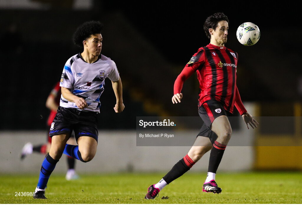 18 February 2023; Sam Verdon of Longford Town in action against Charles Mutawe of Athlone Town during the SSE Airtricity Men's First Division match between Longford Town and Athlone Town at Bishopsgate in Longford. Photo by Michael P Ryan/Sportsfile