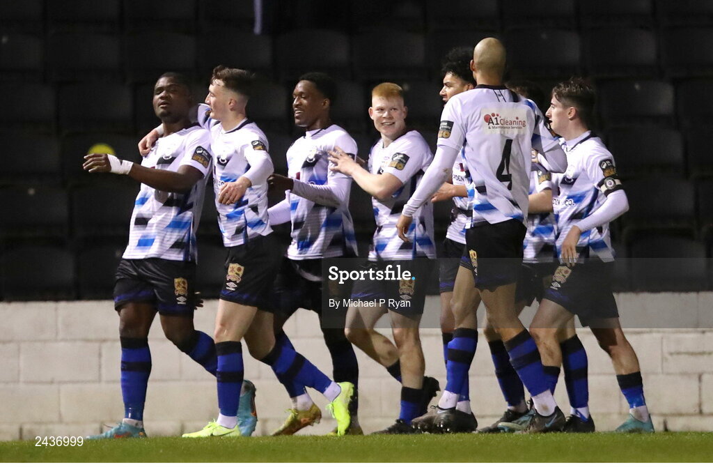 18 February 2023; Frantz Pierrot of Athlone Town, left, celebrates with teammates after scoring his side's first goal during the SSE Airtricity Men's First Division match between Longford Town and Athlone Town at Bishopsgate in Longford. Photo by Michael P Ryan/Sportsfile