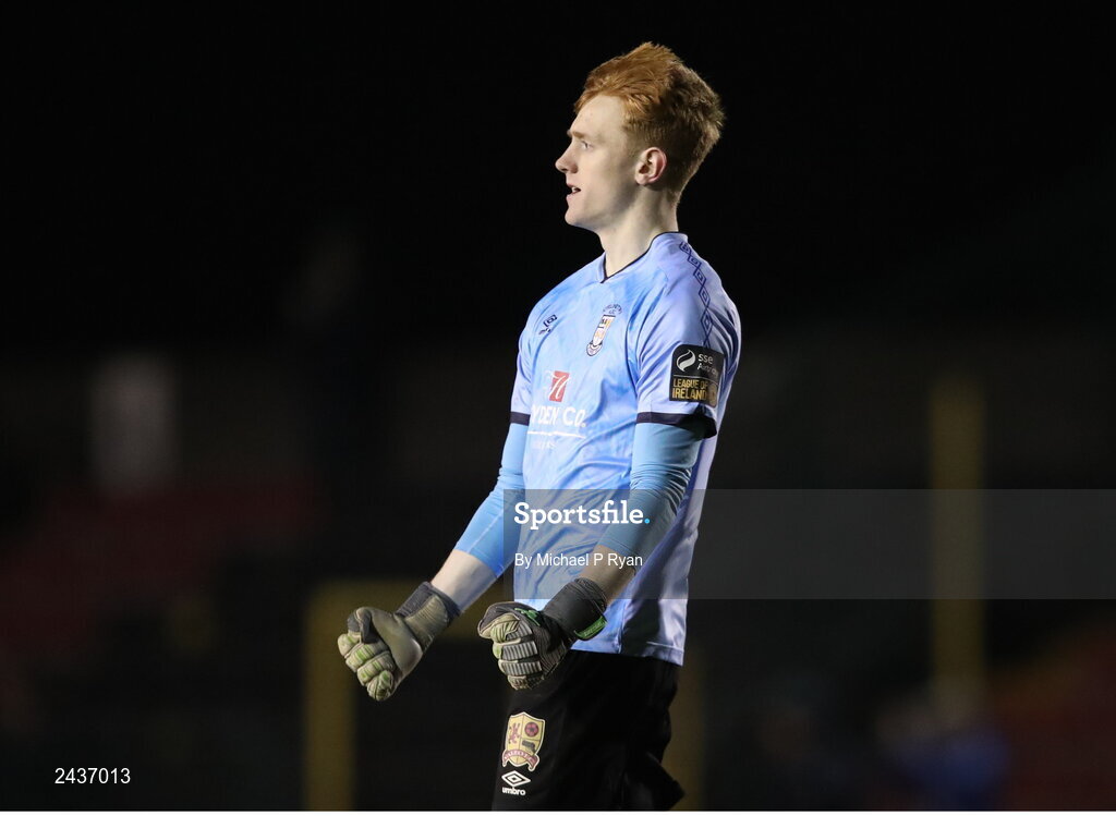 18 February 2023; Athlone Town goalkeeper Enda Minogue celebrates his side's first goal scored by Frantz Pierrot during the SSE Airtricity Men's First Division match between Longford Town and Athlone Town at Bishopsgate in Longford. Photo by Michael P Ryan/Sportsfile