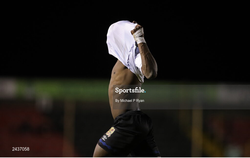 18 February 2023; Frantz Pierrot of Athlone Town celebrates after scoring his side's third goal during the SSE Airtricity Men's First Division match between Longford Town and Athlone Town at Bishopsgate in Longford. Photo by Michael P Ryan/Sportsfile