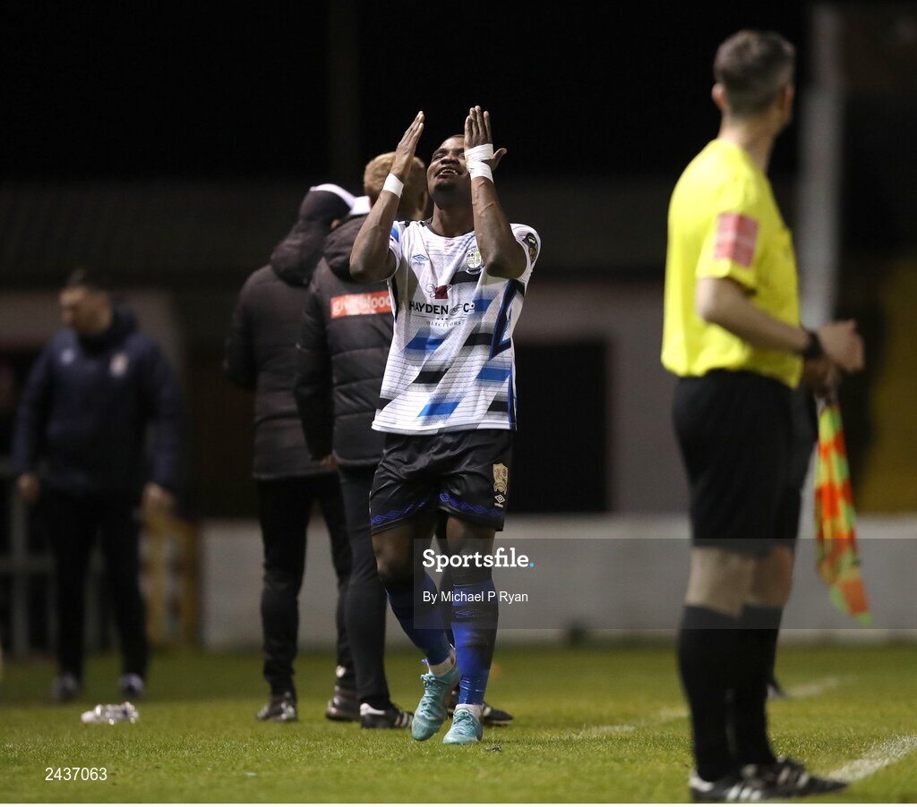 18 February 2023; Frantz Pierrot of Athlone Town leaves the field after receiving a second yellow card during the SSE Airtricity Men's First Division match between Longford Town and Athlone Town at Bishopsgate in Longford. Photo by Michael P Ryan/Sportsfile