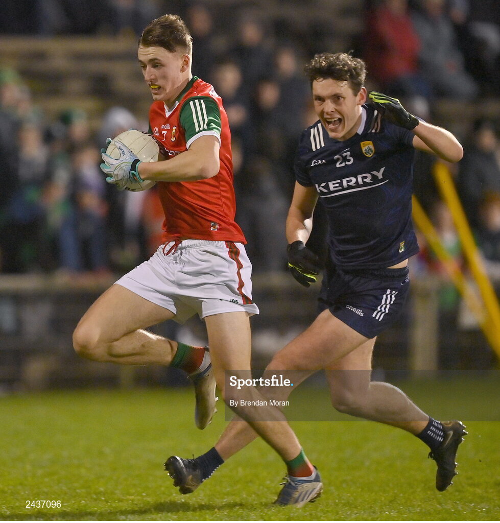 18 February 2023; Donnacha McHugh of Mayo in action against David Clifford of Kerry during the Allianz Football League Division One match between Mayo and Kerry at Hastings Insurance MacHale Park in Castlebar, Mayo. Photo by Brendan Moran/Sportsfile