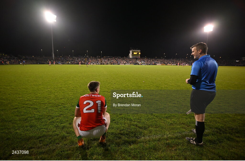 18 February 2023; Cillian O'Connor of Mayo and standby referee Thomas Murphy in conversation during the Allianz Football League Division One match between Mayo and Kerry at Hastings Insurance MacHale Park in Castlebar, Mayo. Photo by Brendan Moran/Sportsfile