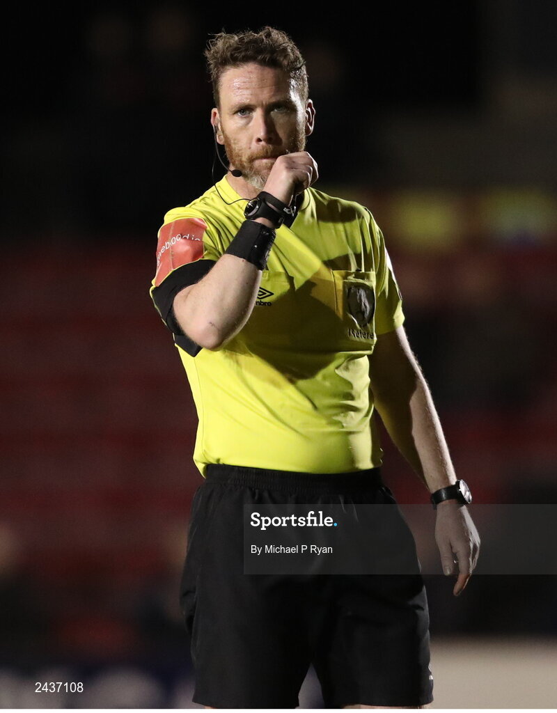 18 February 2023; Referee Eoghan O'Shea during the SSE Airtricity Men's First Division match between Longford Town and Athlone Town at Bishopsgate in Longford. Photo by Michael P Ryan/Sportsfile