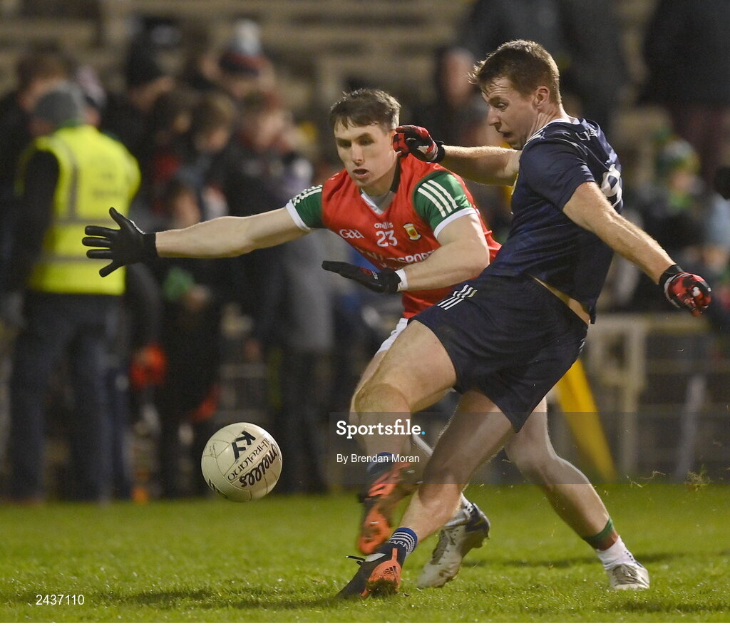 18 February 2023; Barry O’Sullivan of Kerry scores his side's first goal despite the bst efforts of Paddy Durcan of Mayo during the Allianz Football League Division One match between Mayo and Kerry at Hastings Insurance MacHale Park in Castlebar, Mayo. Photo by Brendan Moran/Sportsfile