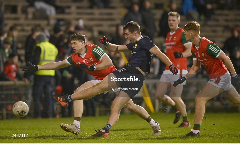 18 February 2023; Barry O’Sullivan of Kerry scores his side's first goal despite the bst efforts of Paddy Durcan of Mayo during the Allianz Football League Division One match between Mayo and Kerry at Hastings Insurance MacHale Park in Castlebar, Mayo. Photo by Brendan Moran/Sportsfile