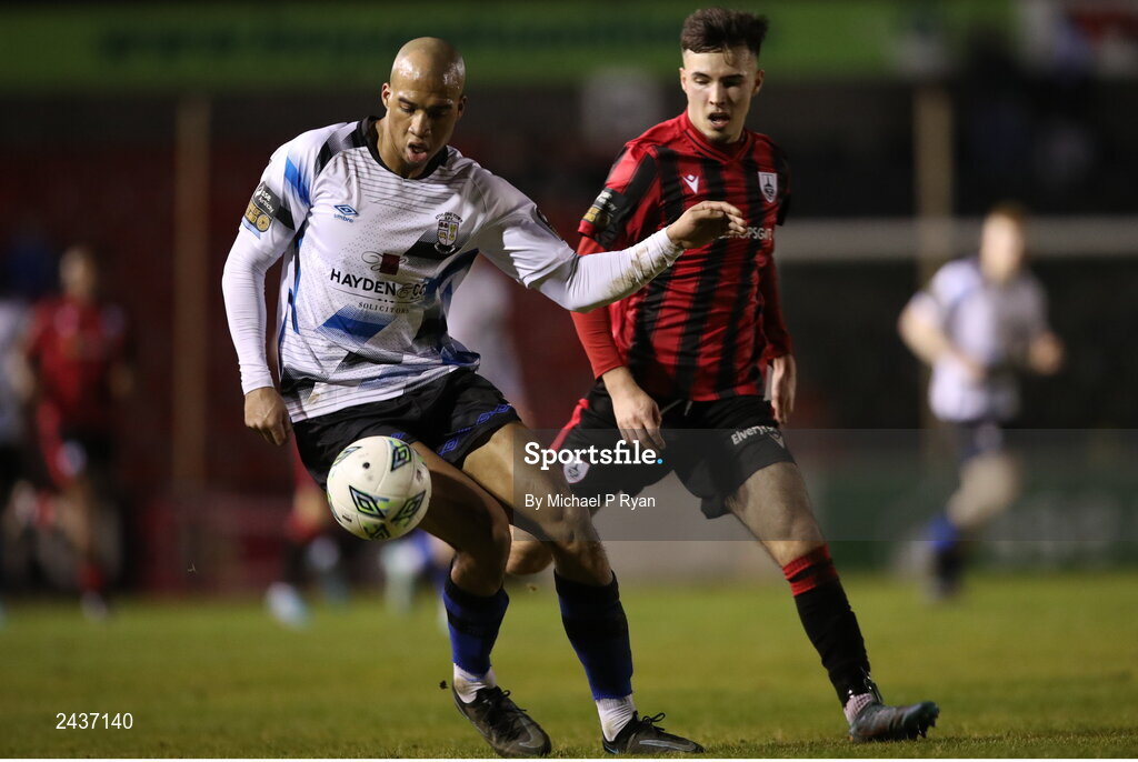 18 February 2023; Noah Van Geenan of Athlone Town in action against Joshua Giurgi of Longford Town during the SSE Airtricity Men's First Division match between Longford Town and Athlone Town at Bishopsgate in Longford. Photo by Michael P Ryan/Sportsfile