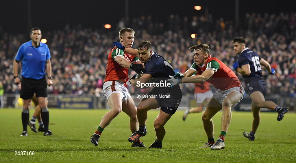 18 February 2023; Darragh Roche of Kerry in action against Ryan O'Donoghue and Donnacha McHugh of Mayo during the Allianz Football League Division One match between Mayo and Kerry at Hastings Insurance MacHale Park in Castlebar, Mayo. Photo by Brendan Moran/Sportsfile