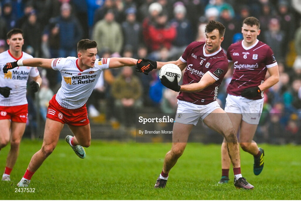 19 February 2023; Paul Conroy of Galway is tackled by Michael McKernan of Tyrone during the Allianz Football League Division One match between Galway and Tyrone at St Jarlath's Park in Tuam, Galway. Photo by Brendan Moran/Sportsfile