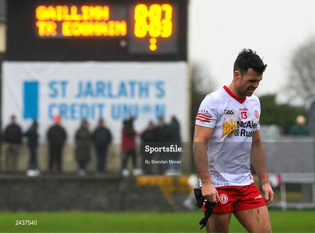 19 February 2023; Darren McCurry of Tyrone leaves the pitch at half-time with the core reading Galway 0-07 and Tyrone 0-03 during the Allianz Football League Division One match between Galway and Tyrone at St Jarlath's Park in Tuam, Galway. Photo by Brendan Moran/Sportsfile