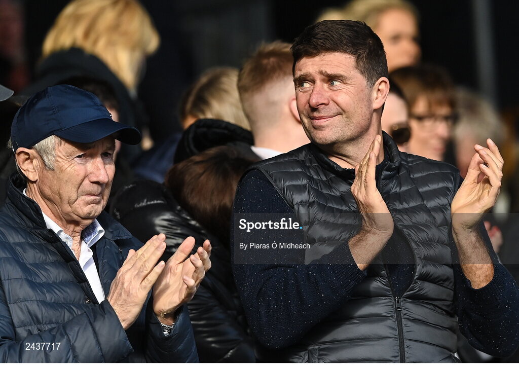 19 February 2023; Former Republic of Ireland International Niall Quinn and Michael Lowry TD, left, in attendance at the Dillon Quirke Foundation Hurling Challenge match between Tipperary and Kilkenny at FBD Semple Stadium in Thurles, Tipperary. Photo by Piaras Ó Mídheach/Sportsfile