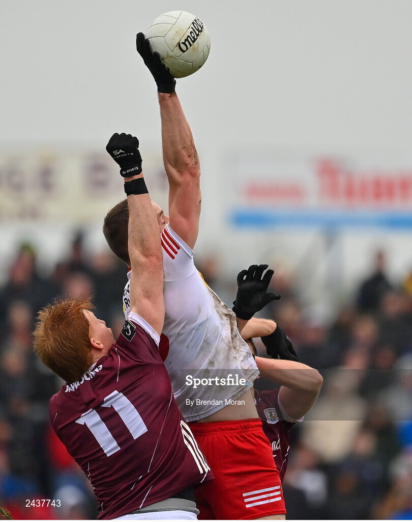 19 February 2023; Brian Kennedy of Tyrone in action against Peter Cooke of Galway during the Allianz Football League Division One match between Galway and Tyrone at St Jarlath's Park in Tuam, Galway. Photo by Brendan Moran/Sportsfile