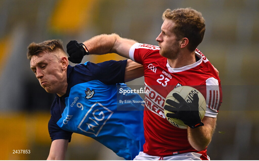 19 February 2023; Ruairí Deane of Cork is tackled by Tom Lahiff of Dublin during the Allianz Football League Division Two match between Cork and Dublin at Páirc Ui Chaoimh in Cork. Photo by Eóin Noonan/Sportsfile