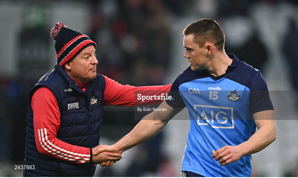 19 February 2023; Con O'Callaghan of Dublin shakes hands with Cork manager John Cleary after the Allianz Football League Division Two match between Cork and Dublin at Páirc Ui Chaoimh in Cork. Photo by Eóin Noonan/Sportsfile