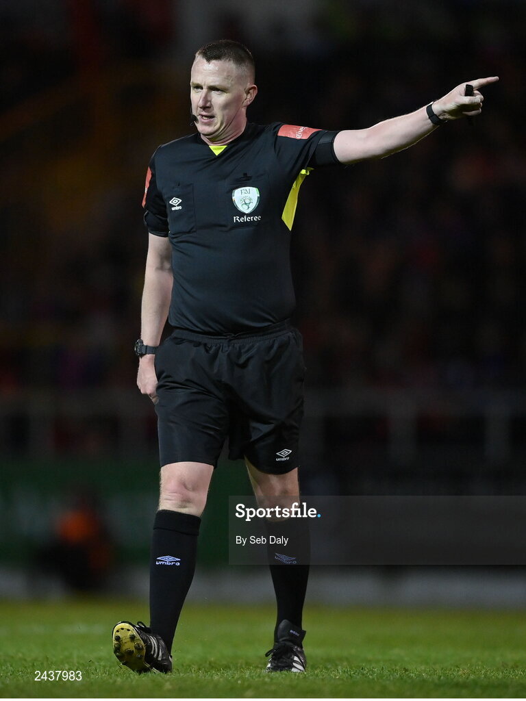 18 February 2023; Referee Damien MacGraith during the SSE Airtricity Men's Premier Division match between Sligo Rovers and Shamrock Rovers at The Showgrounds in Sligo. Photo by Seb Daly/Sportsfile
