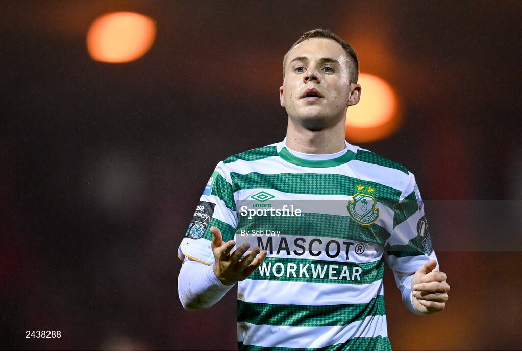 18 February 2023; Liam Burt of Shamrock Rovers during the SSE Airtricity Men's Premier Division match between Sligo Rovers and Shamrock Rovers at The Showgrounds in Sligo. Photo by Seb Daly/Sportsfile