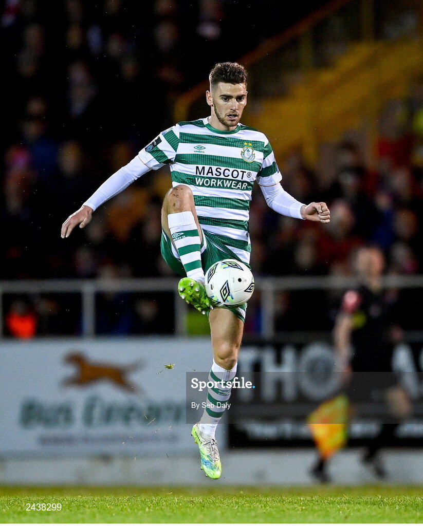 18 February 2023; Dylan Watts of Shamrock Rovers during the SSE Airtricity Men's Premier Division match between Sligo Rovers and Shamrock Rovers at The Showgrounds in Sligo. Photo by Seb Daly/Sportsfile
