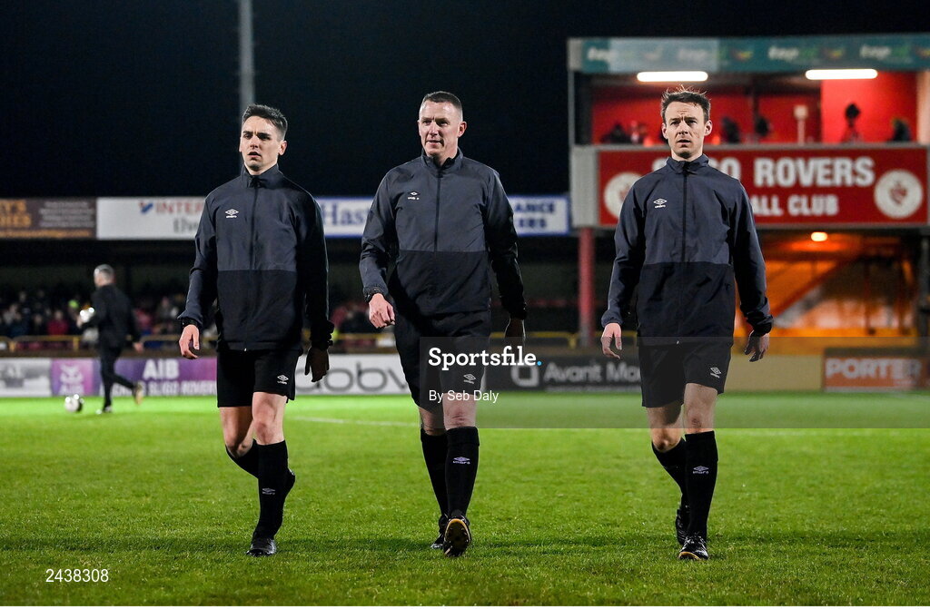 18 February 2023; Referee Damien MacGraith, centre, with assistants Shane O'Brien, left, and Chris Campbell, right, before the SSE Airtricity Men's Premier Division match between Sligo Rovers and Shamrock Rovers at The Showgrounds in Sligo. Photo by Seb Daly/Sportsfile