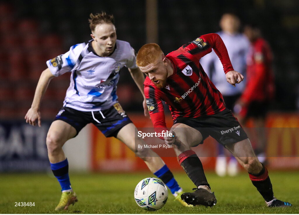 18 February 2023; Aodh Dervin of Longford Town in action against Valerii Dolia of Athlone Town during the SSE Airtricity Men's First Division match between Longford Town and Athlone Town at Bishopsgate in Longford. Photo by Michael P Ryan/Sportsfile