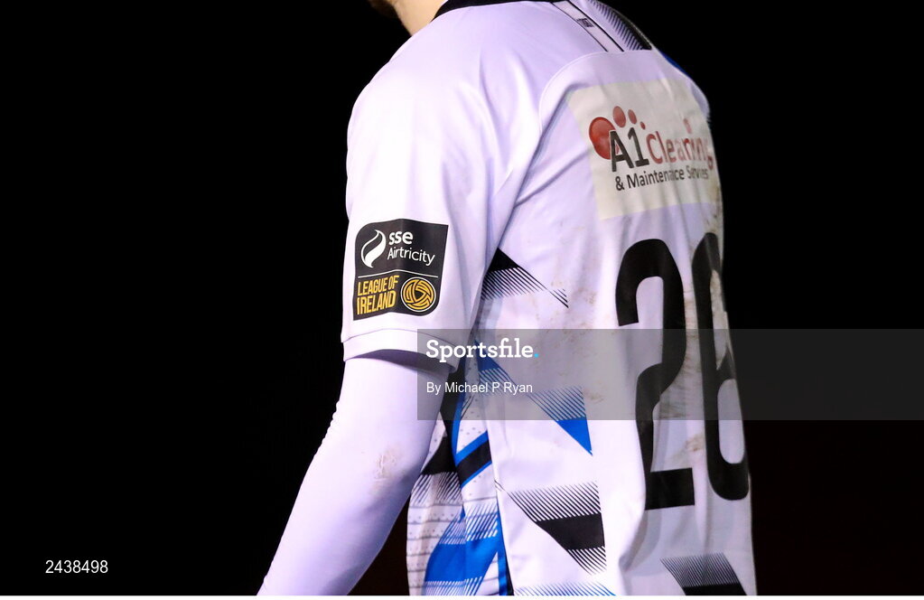 18 February 2023; A view of the League of Ireland badge on the sleeve of Donal Curtin of Athlone Town during the SSE Airtricity Men's First Division match between Longford Town and Athlone Town at Bishopsgate in Longford. Photo by Michael P Ryan/Sportsfile
