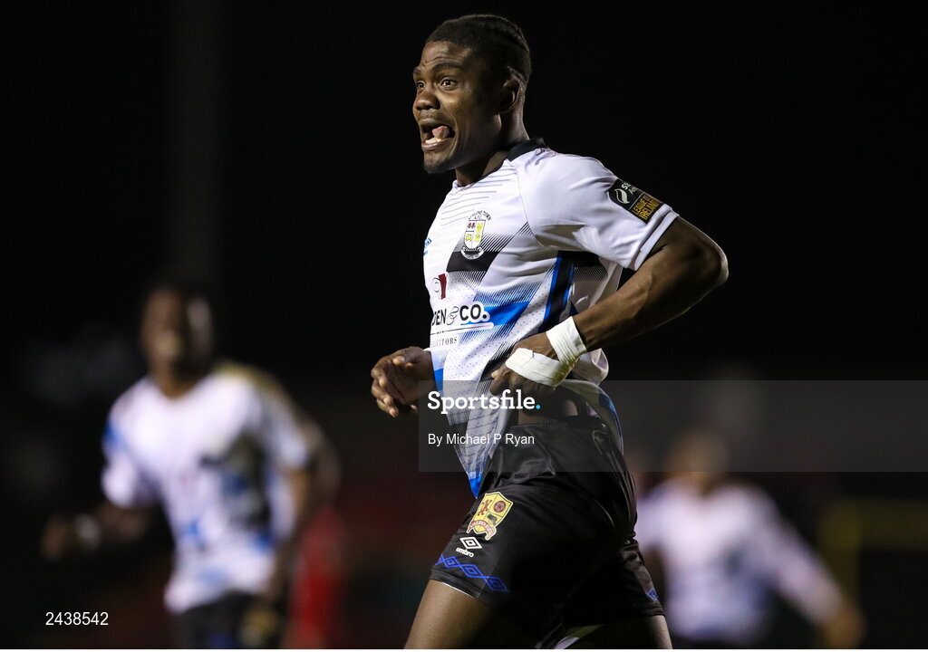 18 February 2023; Frantz Pierrot of Athlone Town celebrates after scoring his side's third goal during the SSE Airtricity Men's First Division match between Longford Town and Athlone Town at Bishopsgate in Longford. Photo by Michael P Ryan/Sportsfile