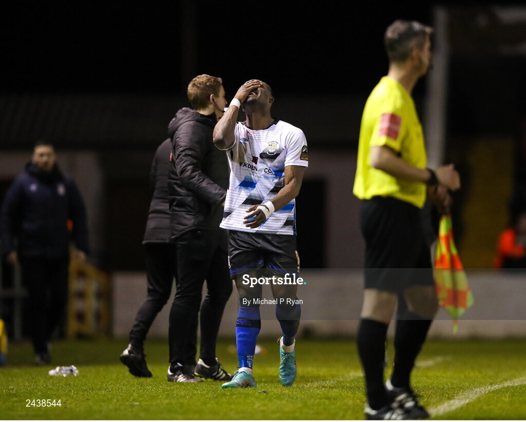 18 February 2023; Frantz Pierrot of Athlone Town leaves the field after receiving a second yellow card during the SSE Airtricity Men's First Division match between Longford Town and Athlone Town at Bishopsgate in Longford. Photo by Michael P Ryan/Sportsfile