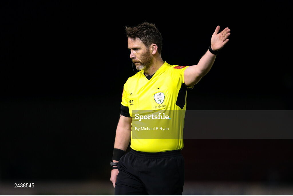 18 February 2023; Referee Eoghan O'Shea during the SSE Airtricity Men's First Division match between Longford Town and Athlone Town at Bishopsgate in Longford. Photo by Michael P Ryan/Sportsfile