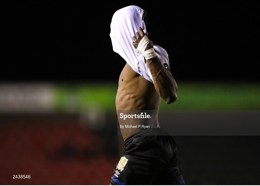 18 February 2023; Frantz Pierrot of Athlone Town celebrates after scoring his side's third goal during the SSE Airtricity Men's First Division match between Longford Town and Athlone Town at Bishopsgate in Longford. Photo by Michael P Ryan/Sportsfile
