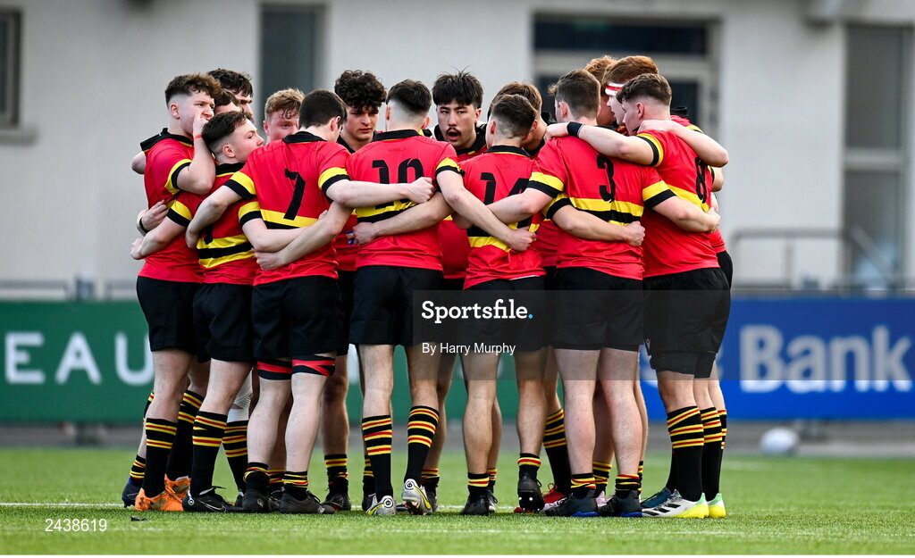 20 February 2023; CBC Monkstown players huddle before the Bank of Ireland Leinster Rugby Schools Senior Cup Quarter Final match between CBC Monkstown and Newbridge College at Energia Park in Dublin. Photo by Harry Murphy/Sportsfile