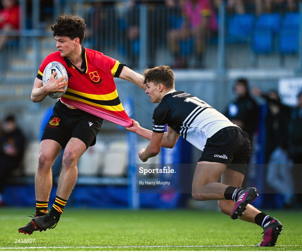20 February 2023; Cal Traynor-Ryssell of CBC Monkstown is tackled by Todd Lawlor of Newbridge College during the Bank of Ireland Leinster Rugby Schools Senior Cup Quarter Final match between CBC Monkstown and Newbridge College at Energia Park in Dublin. Photo by Harry Murphy/Sportsfile