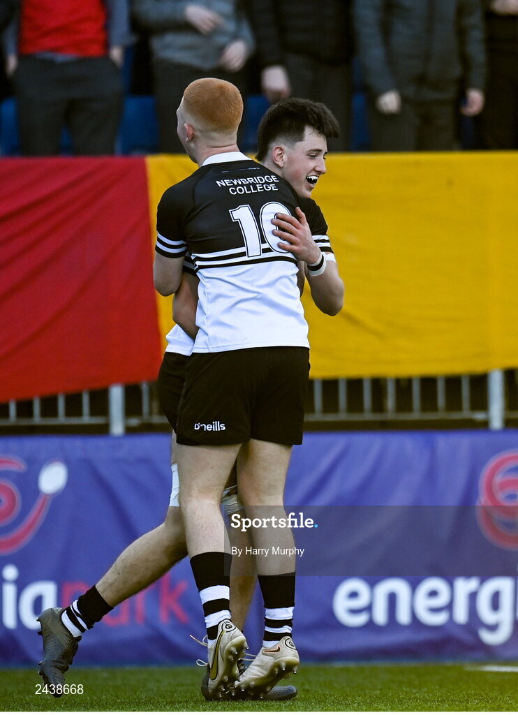 20 February 2023; Ruairi Munnelly of Newbridge College celebrates with teammate Paddy Martin after scoring his side's fifth try during the Bank of Ireland Leinster Rugby Schools Senior Cup Quarter Final match between CBC Monkstown and Newbridge College at Energia Park in Dublin. Photo by Harry Murphy/Sportsfile