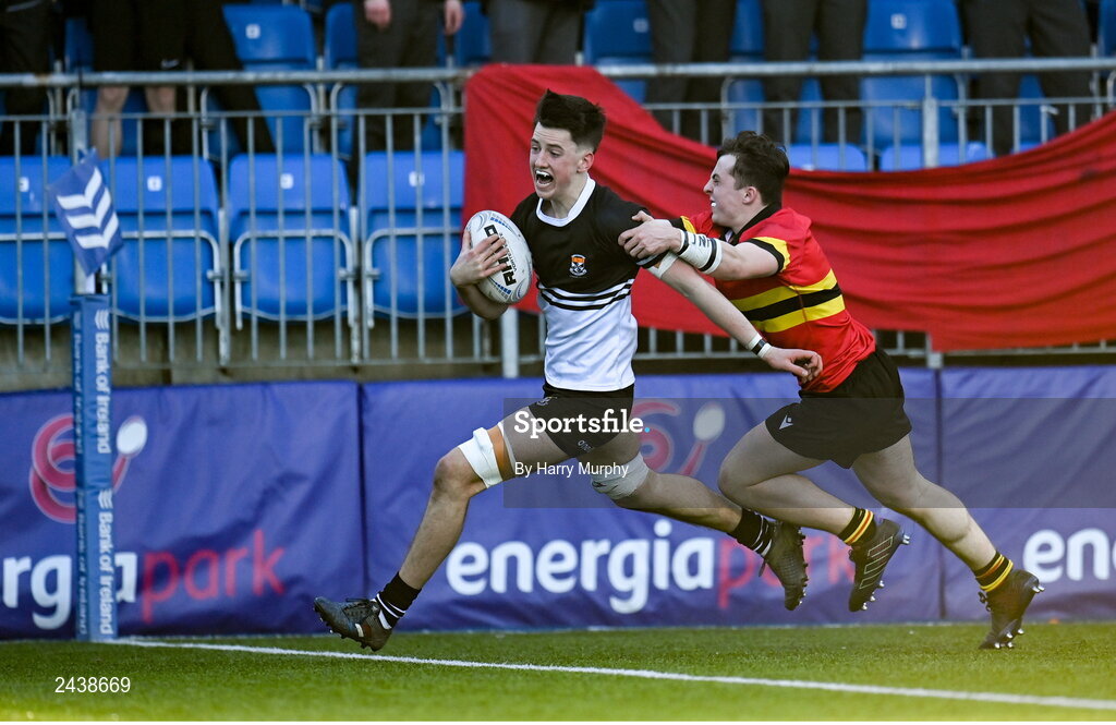 20 February 2023; Ruairi Munnelly of Newbridge College on his way to scoring his side's fifth try despite the tackle of Luan Moloney of CBC Monkstown during the Bank of Ireland Leinster Rugby Schools Senior Cup Quarter Final match between CBC Monkstown and Newbridge College at Energia Park in Dublin. Photo by Harry Murphy/Sportsfile