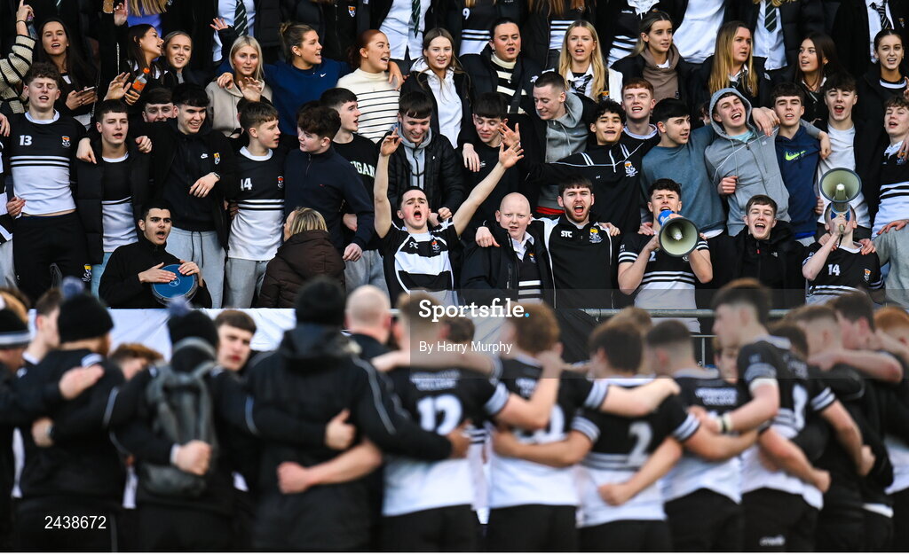 20 February 2023; Newbridge College supporters after their side's victory in the Bank of Ireland Leinster Rugby Schools Senior Cup Quarter Final match between CBC Monkstown and Newbridge College at Energia Park in Dublin. Photo by Harry Murphy/Sportsfile