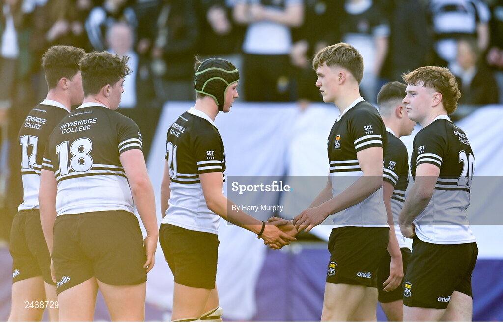 20 February 2023; Daniel Cox, 21, and Jack Dennis of Newbridge College after their side's victory in the Bank of Ireland Leinster Rugby Schools Senior Cup Quarter Final match between CBC Monkstown and Newbridge College at Energia Park in Dublin. Photo by Harry Murphy/Sportsfile