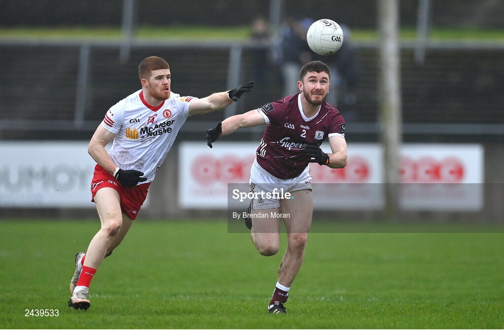 19 February 2023; Eoghan Kelly of Galway in action against Cathal McShane of Tyrone during the Allianz Football League Division One match between Galway and Tyrone at St Jarlath's Park in Tuam, Galway. Photo by Brendan Moran/Sportsfile