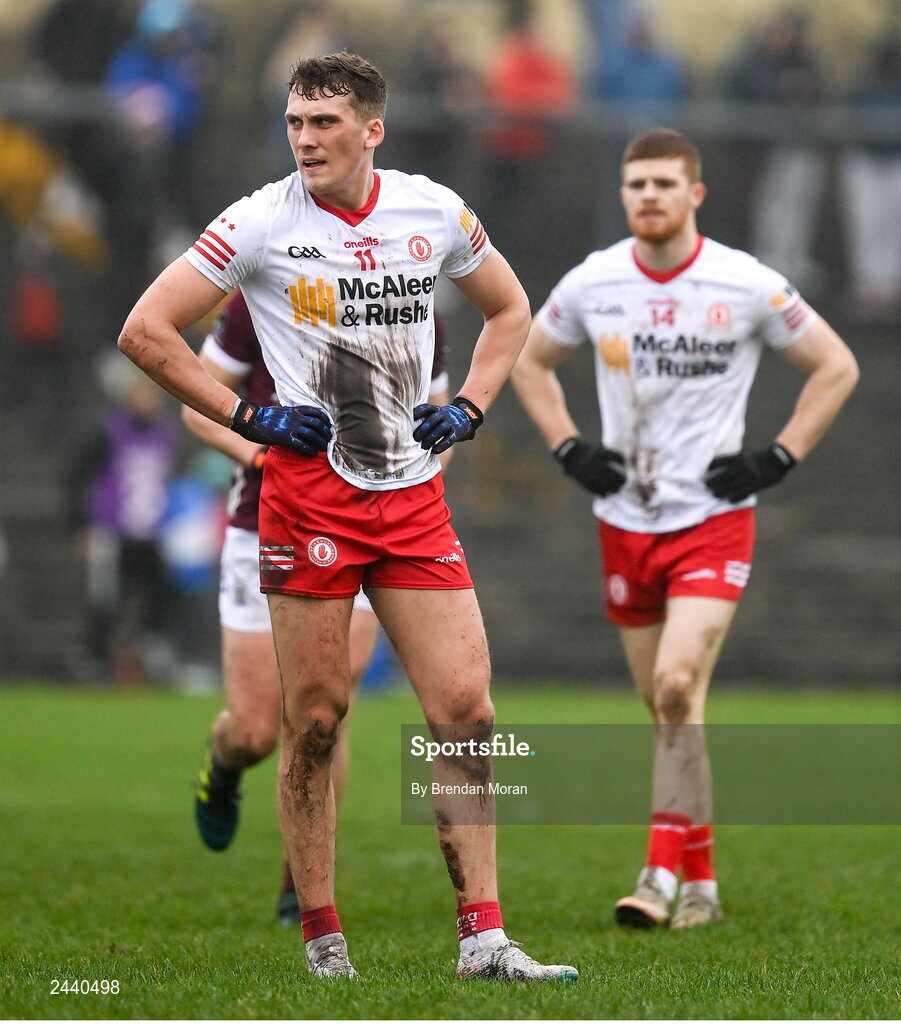 19 February 2023; Conn Kilpatrick, left, and Cathal McShane of Tyrone react as the halftime whistle is blown during the Allianz Football League Division One match between Galway and Tyrone at St Jarlath's Park in Tuam, Galway. Photo by Brendan Moran/Sportsfile