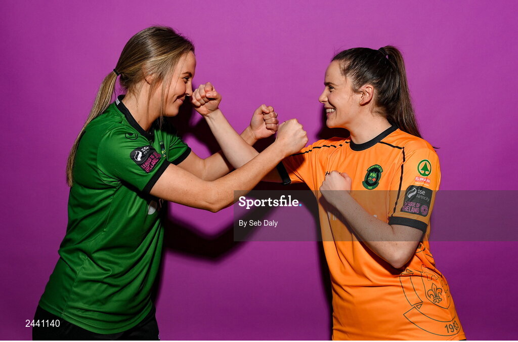 23 February 2023; Chloe Moloney and Niamh Reid Burke pose for a portrait during a Peamount United squad portrait session at PRL Park in Greenogue, Dublin. Photo by Seb Daly/Sportsfile