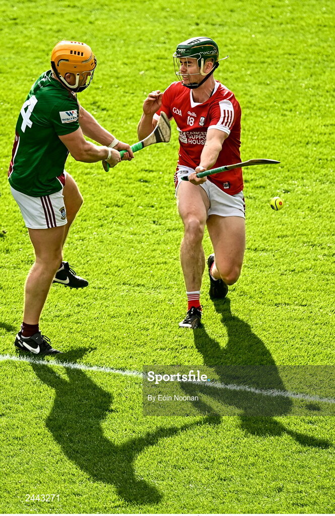 26 February 2023; Davy Glennon of Westmeath is blocked down by Cathail Ó'Cormaic of Cork during the Allianz Hurling League Division 1 Group A match between Cork and Westmeath at Páirc Ui Chaoimh in Cork. Photo by Eóin Noonan/Sportsfile